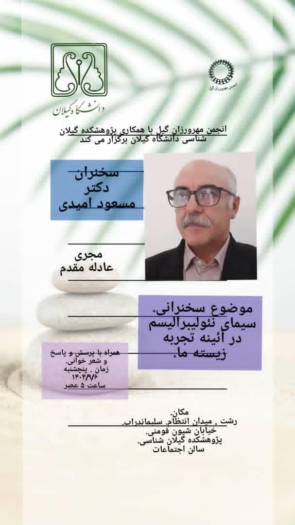 نشست ماهانه انجمن مهرورزان گيلان روز پنجشنبه 6 آذر 1404 با حضور علاقمندان و گيلانشناسان برگزار شد. در اين نشست تخصصي آقاي مسعود اميدي با موضوع ليبراليسم و تاثير آن بر اقتصاد و فرهنگ سخنراني كرد.