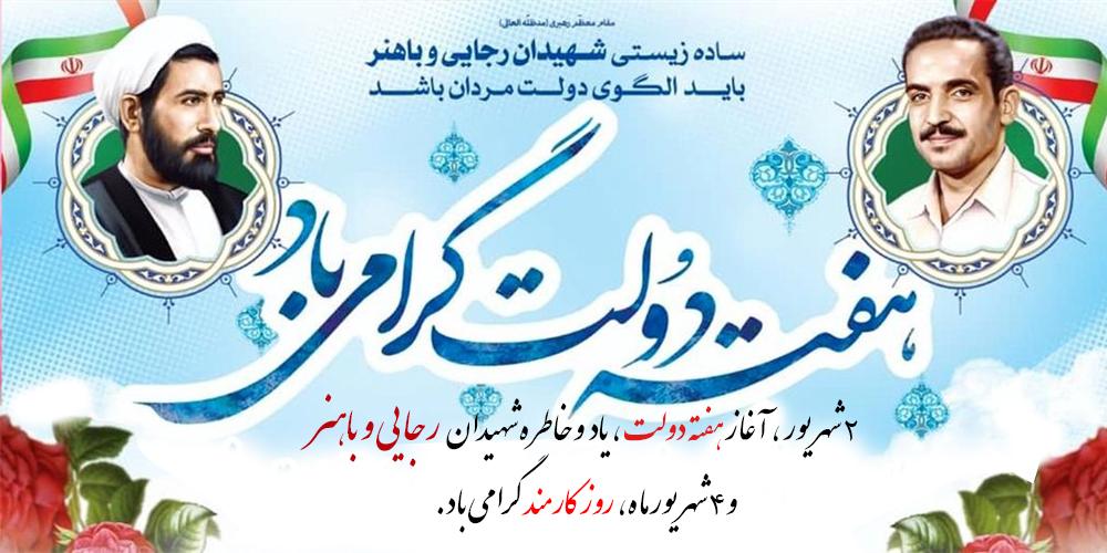 هفته دولت سالروز شهادت شهیدان رجایی و باهنر و روز کارمند بر تمامی کارمندان و خدمتگزاران نظام مقدّس جمهوری اسلامی ایران مبارک باد.